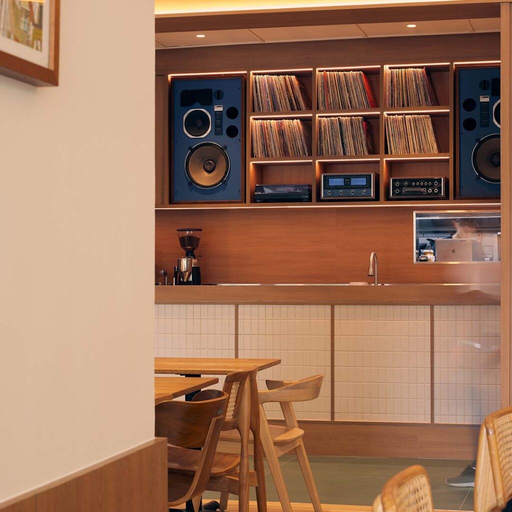 The interior strikes a retro-modern balance, with warm timber finishes, soft lighting, and plush seating that feels inviting without being overstyled. A staircase connects the café to the boutique above, reinforcing the idea of a seamless retail-and-dining experience. One standout detail is the coffee counter, which nods to classic hi-fi culture with vintage-style speakers and illuminated vinyl displays, setting the tone for a space where music plays as important a role as the menu.