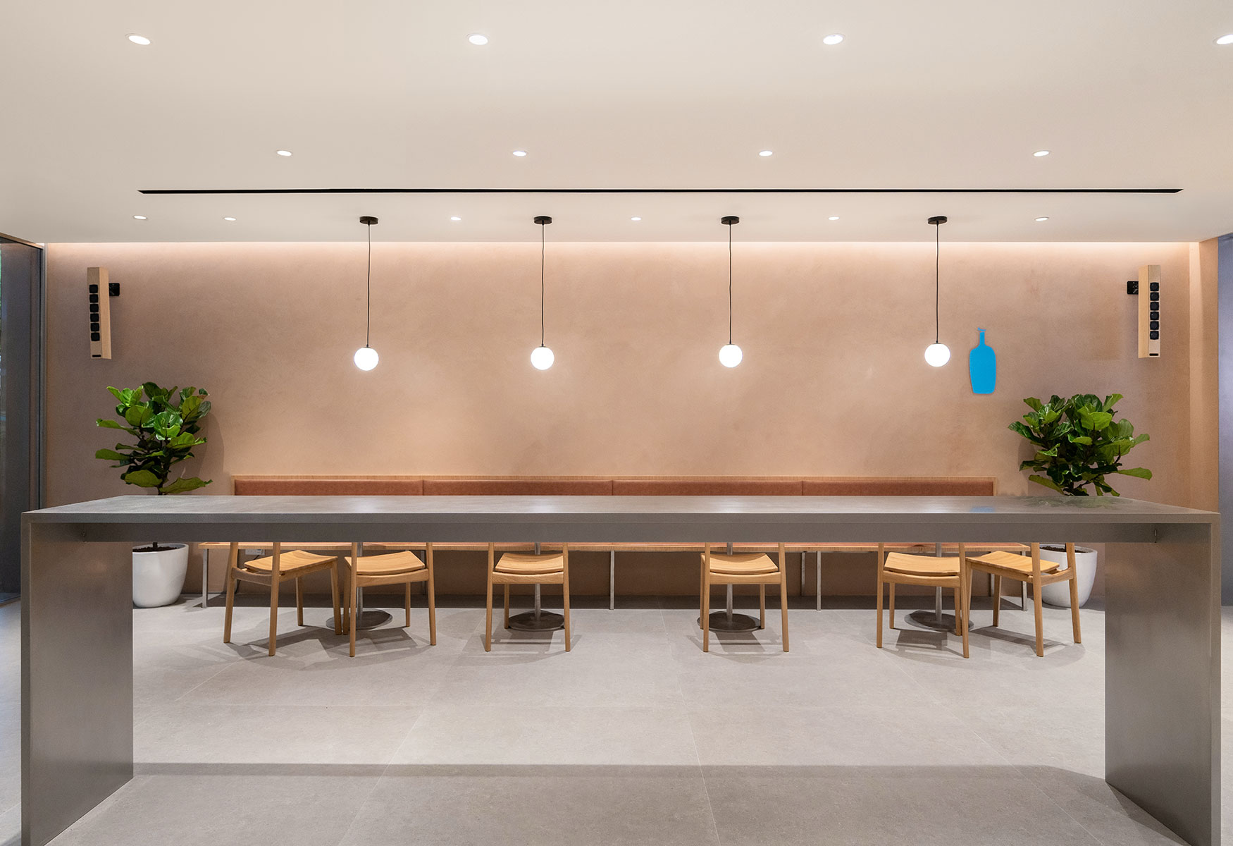 Blue Bottle’s latest cafe at Paragon is its first Singapore outlet to feature alfresco dining, seamlessly blending indoor and outdoor spaces as an extension of Orchard Road’s vibrant streetscape. The indoor area combines stainless steel, oak wood, and terra cotta-toned plaster to evoke modern elegance, while the outdoor space features landscaped planters, ceiling fans, and a variety of seating configurations to reflect Singapore’s love of nature and communal gathering. With 70 seats across 980 square feet, the cafe offers communal tables, two-tops, and benches for both intimate and shared coffee moments.