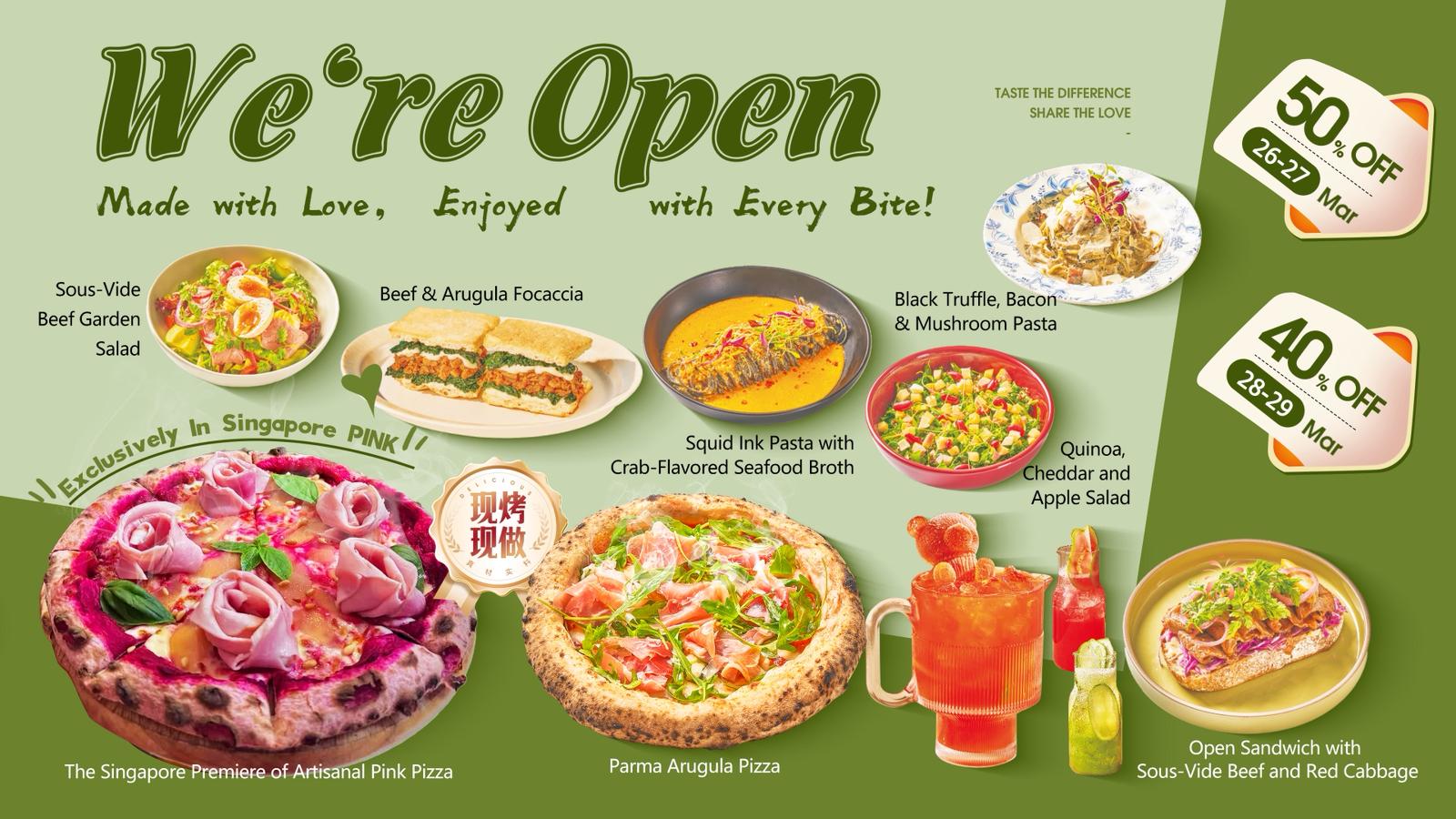 Along with the grand opening, the restaurant will be premiering a new Artisanal Pink Pizza – a pink dough base pizza made from red dragonfruit, topped with cheese and rosebuds designed with specially-imported ham that remind one of the local coffeshop drink – the Bandung, a rose syrup and milk concoction, and a childhood favourite among Singaporeans. Along with the debut of the Artisanal Pink Pizza, Yang Li invites all to try the other popular fusion cuisines with a distinctly Southeast Asian touch like the Sous-Vide Beef Garden Salad, Open Sandwich with Sous-Vide Beef and Red Cabbage and the Squid Ink Pasta with Crab-Flavoured Seafood Broth that merges both a classic Italian pasta dish with the Singaporean’s favourite seafood.
