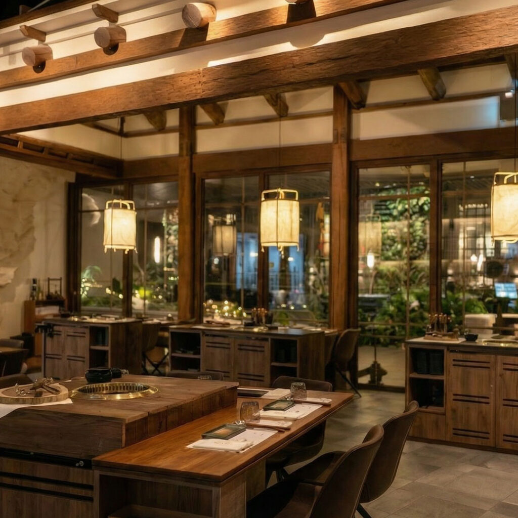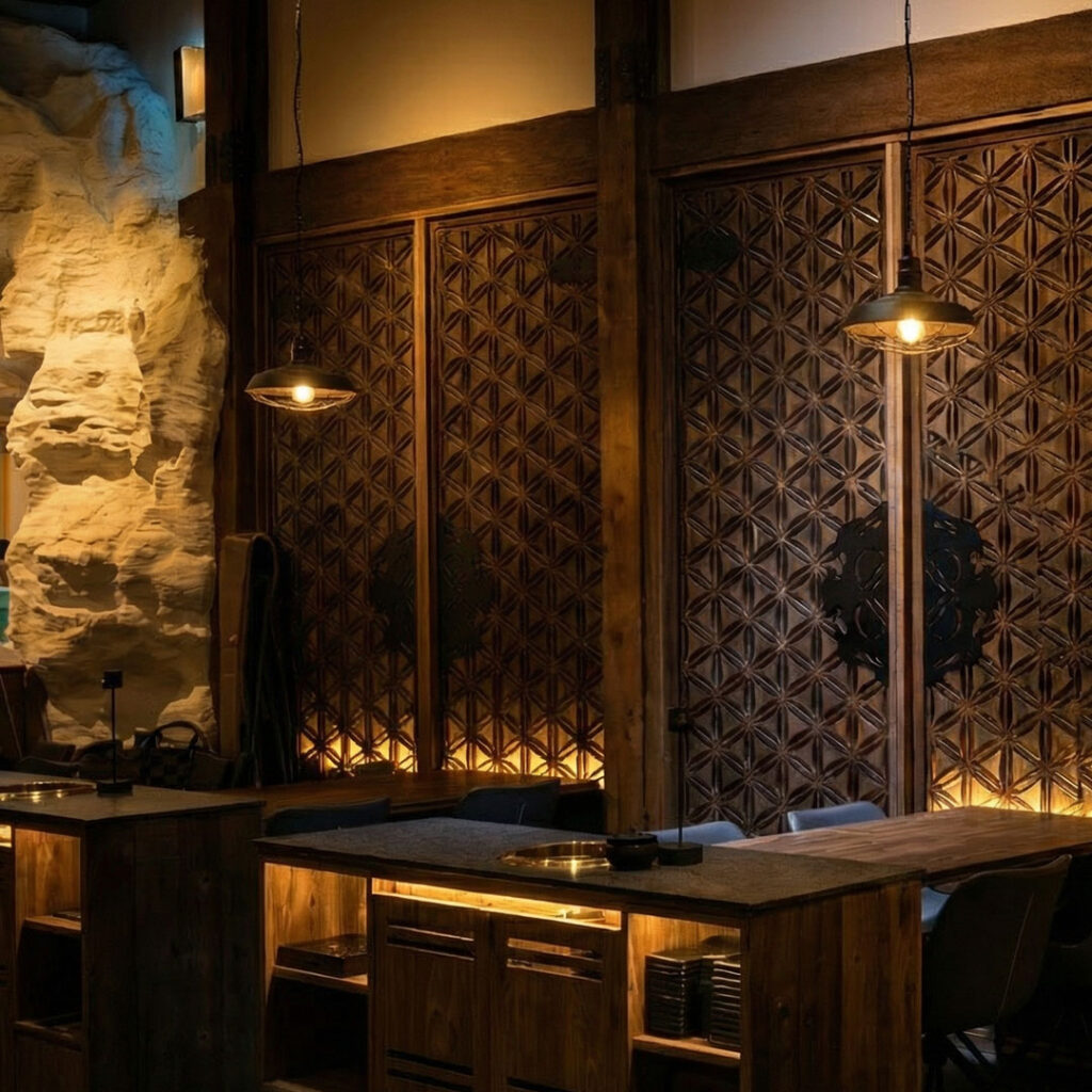 Into the Sanctuary — Inside, warm, low-glow lighting highlights the grain of timber, the texture of stone, and the craftsmanship woven throughout the space. The atmosphere is calm and intimate, designed to help guests settle in and focus on the moment rather than the bustle of a conventional BBQ restaurant.