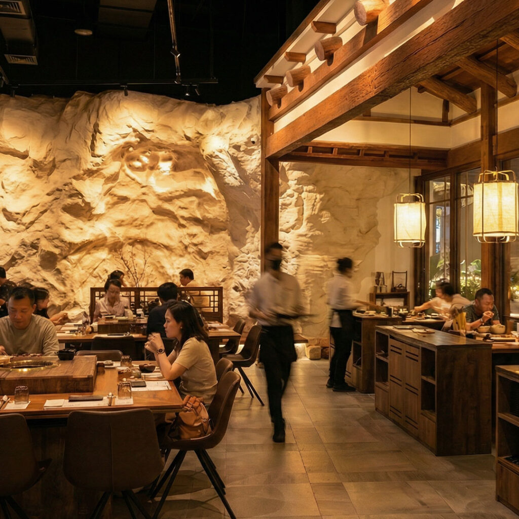 DRIM GOLD’s cave-inspired architecture meets modern Hanok aesthetics, combining sculpted rock walls, warm timber beams, and layered textures. Signature photo zones, the striking feature wall, and the cave entrance offer Instagram-worthy moments, making the restaurant a feast for both the eyes and the palate.