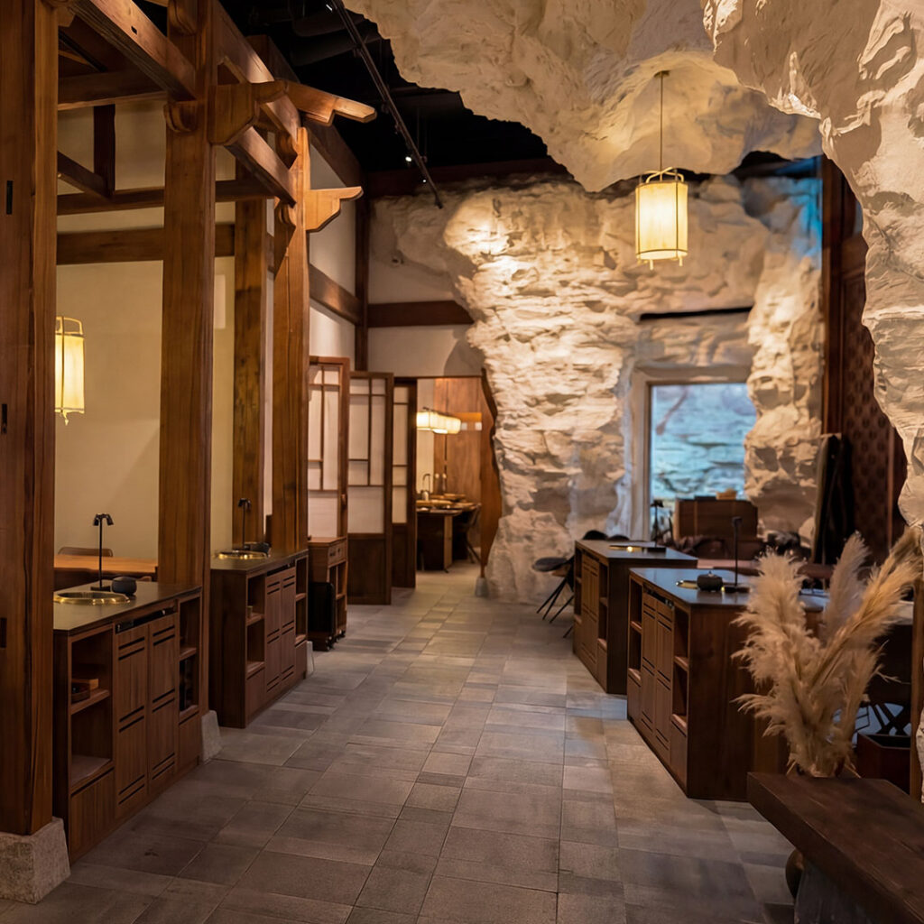 Entrance — Stepping into DRIM GOLD, guests are gently transported away from the outside world. The journey begins at a cave-like threshold, where sculpted rock walls and layered stone forms guide them toward a traditional Hanok wooden door. Crossing this threshold naturally slows the pace and sets the tone for the experience ahead.