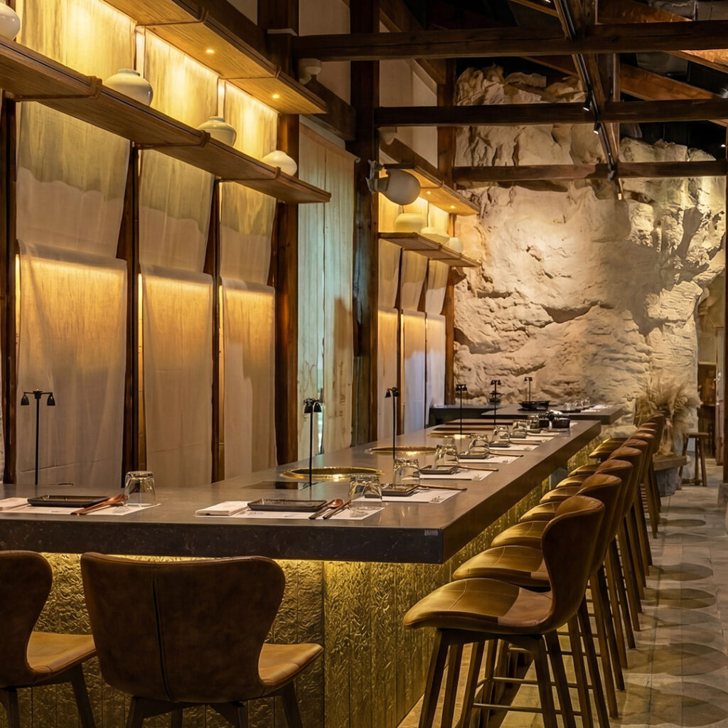 Step into a one-of-a-kind dining sanctuary, where sculpted stone walls, intimate corners, and hidden lighting create a dramatic yet composed space. Every table, from counter seats to private rooms, immerses guests in a sensory journey that allows guests to dine comfortably at their own pace.