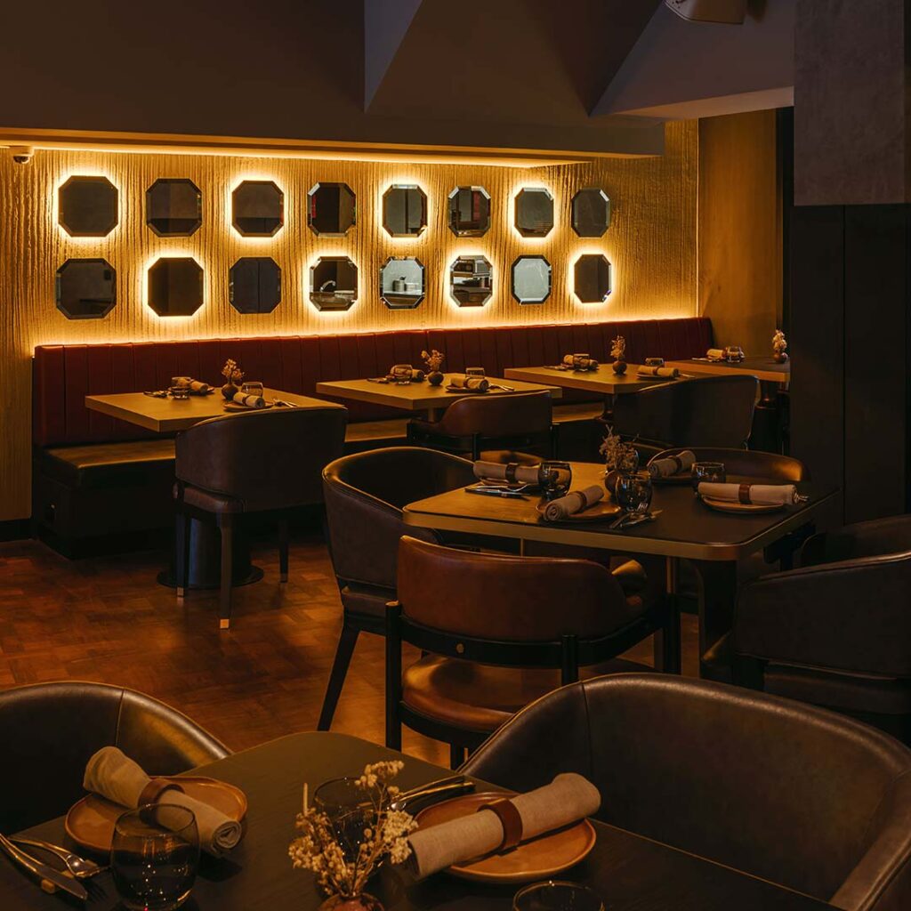 Various seating configurations are available, including bar counter seats perfect for a pre-dinner drink. This is set against the playful domino wall – a nod to the original FOC entrance. Diners will also notice the custom-made Porrón lamps hanging overhead, inspired by the long-spouted wine pitcher used in Spanish festive gatherings. This vessel also represents the area: communal, joyful, and subtly cheeky.