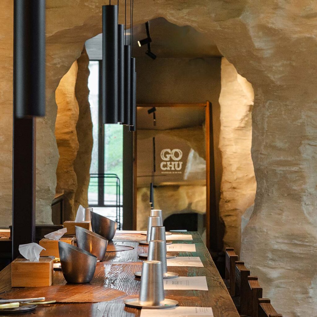 The most distinctive feature of GOCHU is its unique ‘cave’ concept interior. Designed with natural stone walls and PC panels, the space evokes a sense of nature, while glass walls offer a view of the surrounding greenery, making dining a truly special experience.