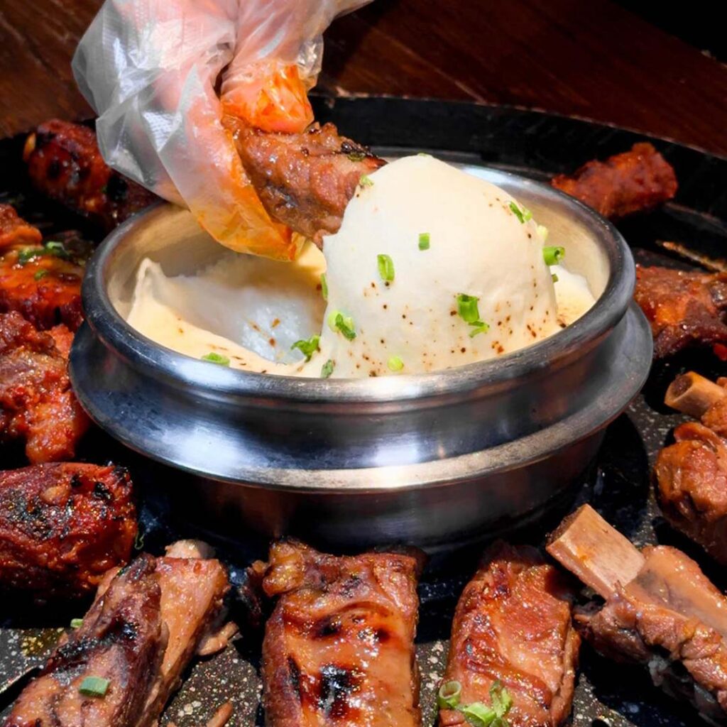 Pork Ribs BBQ 쪽갈비 : A GOCHU signature, these tender pork ribs are first slow-cooked for maximum juiciness, then fire-seared over aromatic oak wood flames for that deep, smoky character. Finally, they’re grilled to perfection at your table on our smokeless grill and finished with our house-made sauce — best enjoyed the primal way, torn by hand.
