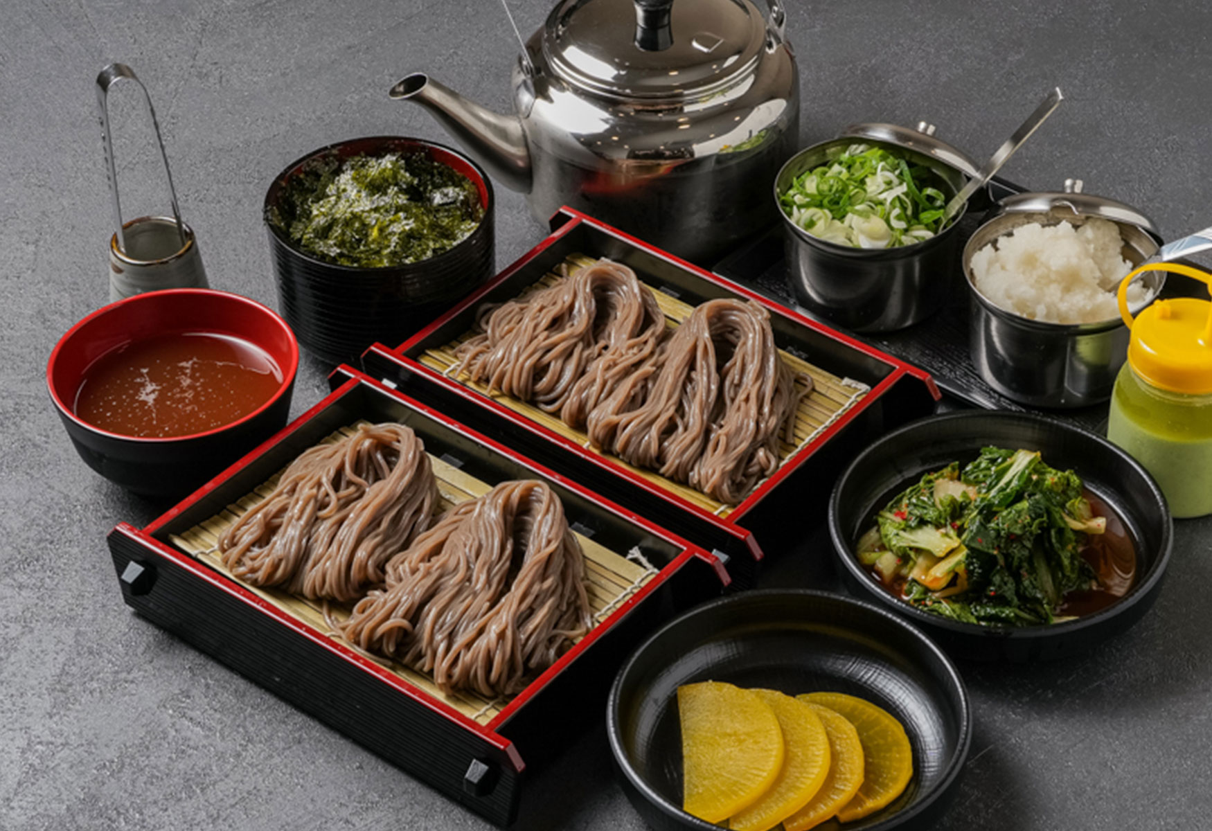 Each serving comes with two trays of chewy, house-made buckwheat noodles, paired with a chilled kettle of seafood-rich dipping broth that is meticulously prepared in Korea and flown directly to Singapore.