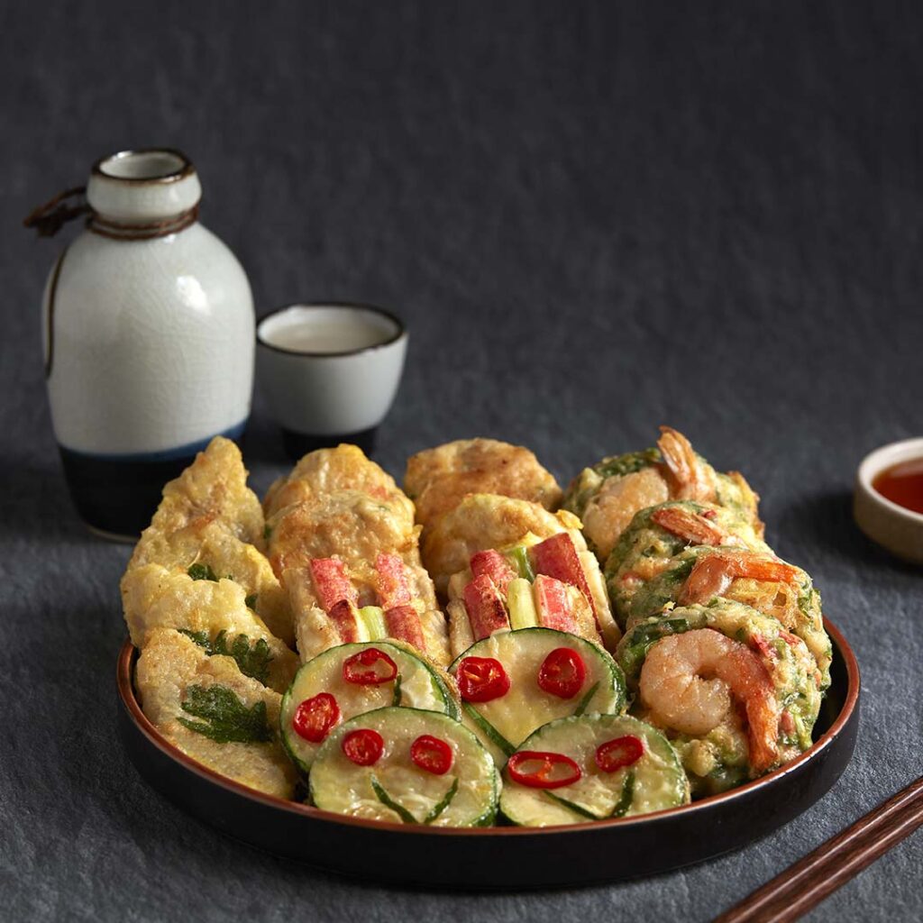 In Korean, “jeon” refers to a variety of pan-fried savoury dishes, typically made by coating ingredients like meat or vegetables in a flour and egg batter, then frying them. A beloved and everyday snack, these Korean-style pancakes or fritters have a long history, dating back to the Joseon Dynasty, where they were enjoyed in royal courts, traditional households, and served during ancestral rites. At Gwangjang GAON, Jeon are handmade daily using Professor Park’s fourth-generation family recipes. The Modm-Jeon ($29.90) platter is anything but ordinary: beautifully arranged, it features golden bites of shrimp, pollack, zucchini, ground pork, and crab surimi, all pan-fried to perfection and served with a tangy soy-vinegar dipping sauce. While traditional jeon is rarely found in restaurants today due to the time and care required, Gwangjang GAON stays true to the craft by preparing each piece meticulously by hand. These crisp and airy fritters are best paired with makgeolli, an unfiltered Korean rice wine.