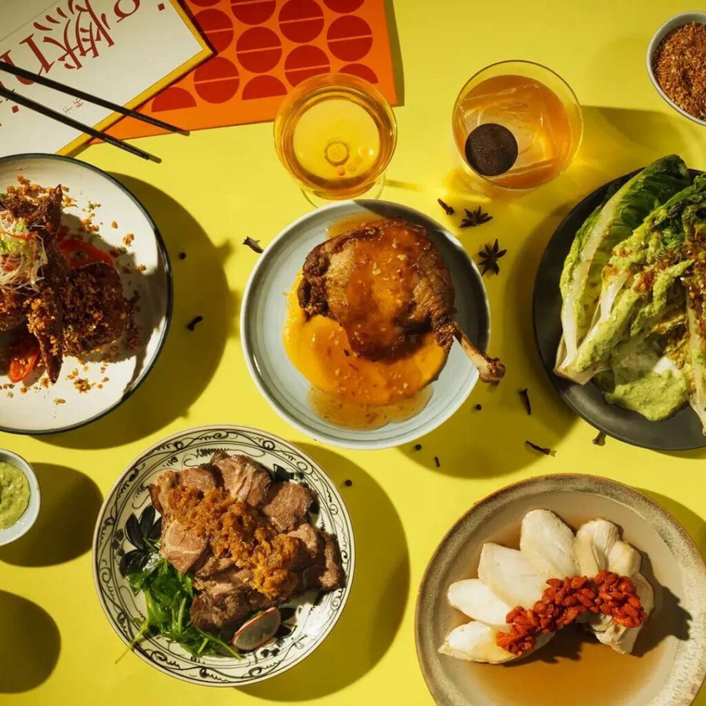 The menu is all about Chinese-inspired plates reimagined with modern flair. Signatures include Typhoon Shelter Wings, painstakingly deboned, fried to golden perfection, and tossed in a fragrant hua tiao wine and Manuka honey glaze, as well as Soft Shell Crab in shrimp paste batter and a smoky-sweet Miso Steak. For heartier fare, the Roasted Duck Leg is crisp on the outside, buttery inside, and paired with silky sweet potato purée and ume sauce. Even the greens make an impression: the Josper-grilled Romaine comes charred and smoky, layered with chilli-coriander aioli and house-fermented yoghurt — a fiery spin on the classic Caesar.