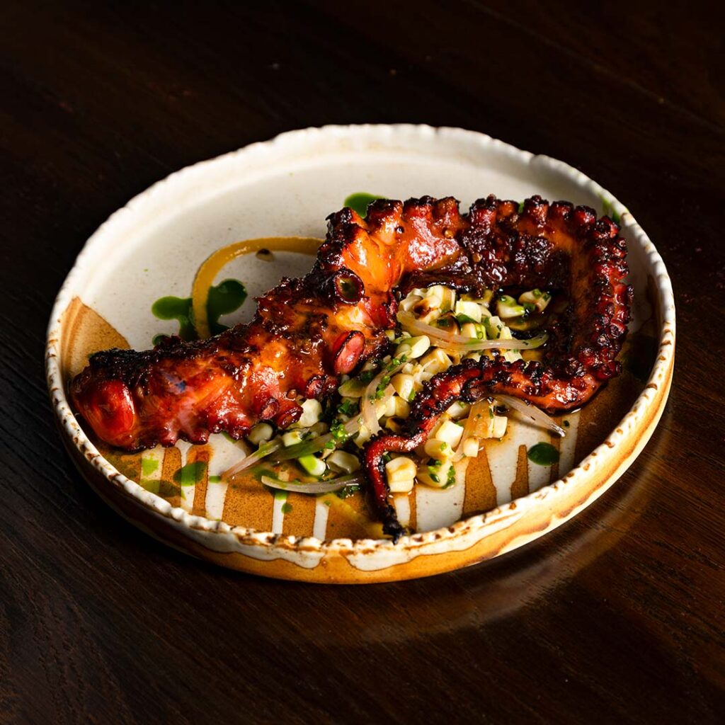 Lighting shifts throughout the day, moving from vibrant energy to golden warmth — mimicking the transition of flames to glowing embers on the grill. A private dining room for up to 8 guests offers exclusivity for special gatherings.