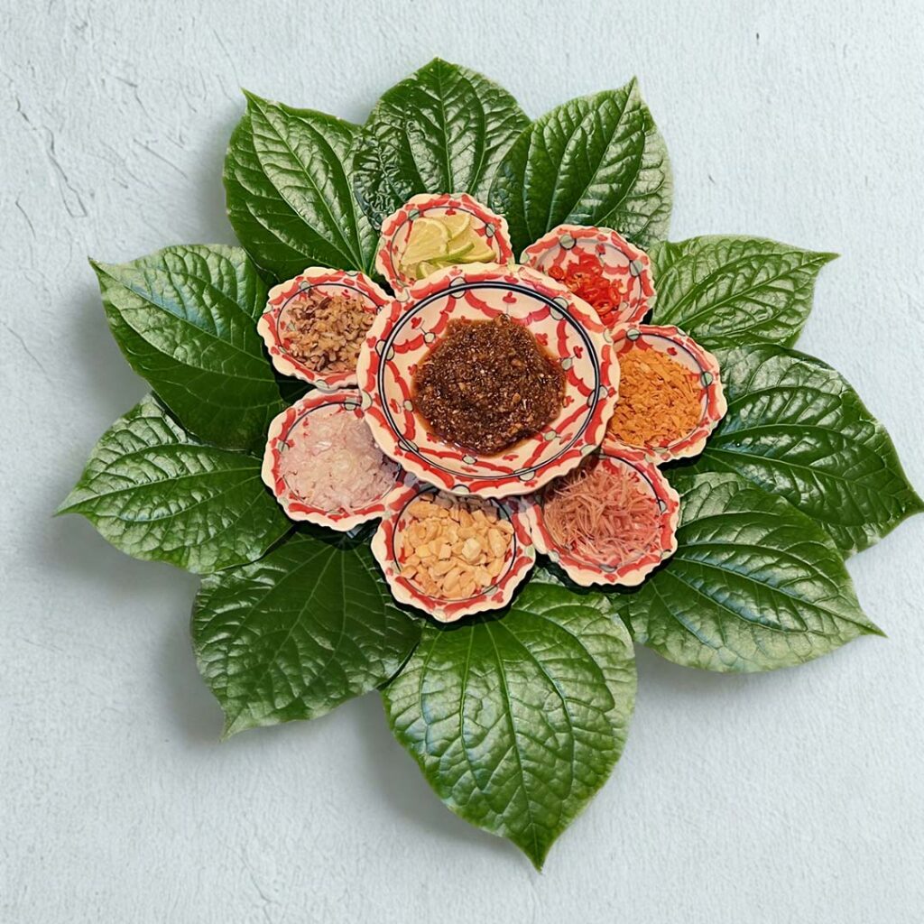 IM JAI, meaning “a full heart” in Thai, is a family affair. Vincent’s mother runs the restaurant alongside him, making it a true labour of love. That spirit carries through in every aspect of the space: cement blossoms of Thailand’s national flower, Dok Koon, bloom across the walls, while hand-painted Benjarong-inspired plates and trays crafted in Thailand set the stage for his inventive curries and house-made sauces.