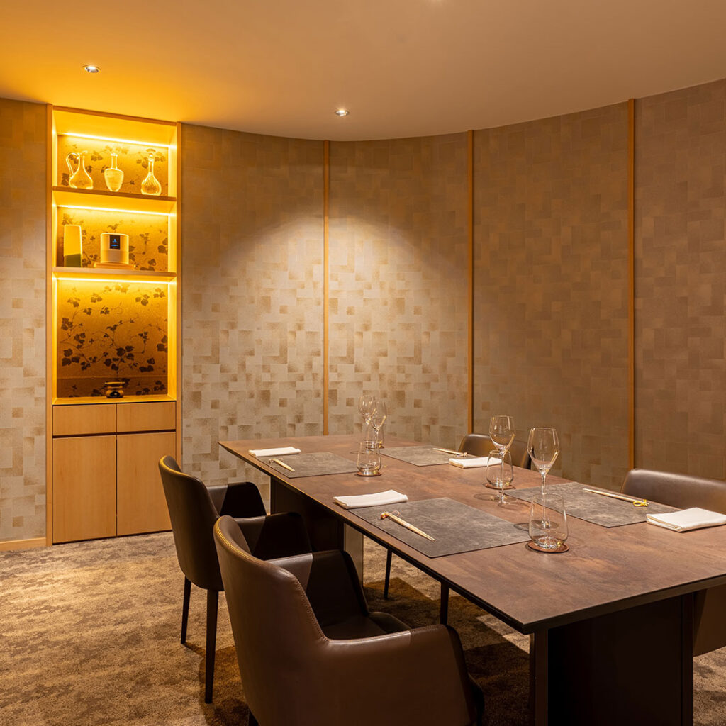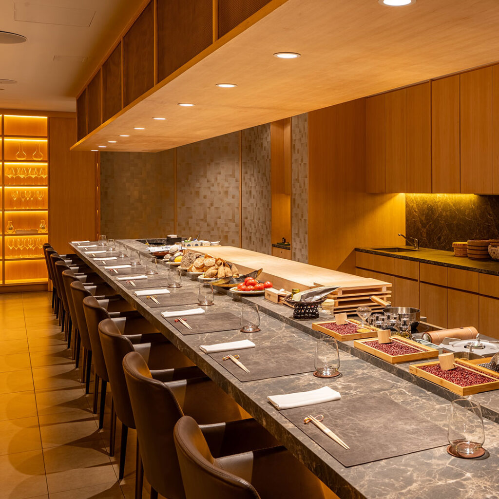 A palette of warm earthy tones and the natural finish reflects the restaurant’s profound affinity with the seasons. Bathed in atmospheric lighting, the feeling is one of connection — with the chefs at the counter; and with one’s dining companions in the private rooms. Combined with the anticipatory service, and the rhythms of the meal, each moment is awash in the spirit of omotenashi.