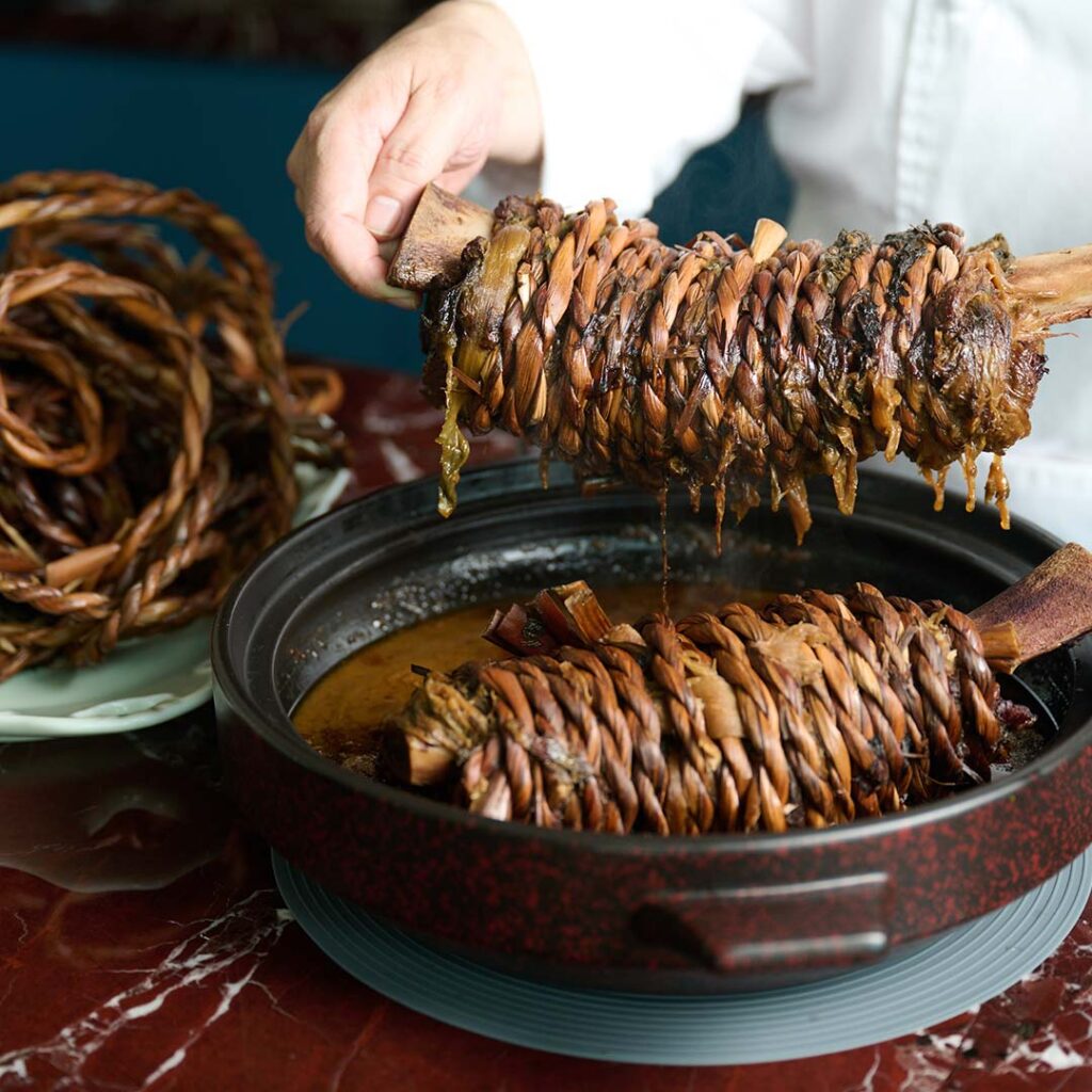 The opening menu captures this philosophy through a seasonal lens, featuring thoughtfully composed dishes that celebrate premium ingredients and cultural refinement. Guided by Chef Li’s vision to showcase the breadth and depth of Cantonese cuisine, Jin Ting Wan’s menu captures its authentic essence, featuring hearty roasted meats, a diverse selection of dim sum, and comforting soups that warm the soul. Signature dishes include the exquisite Roasted Pipa Duck with Black Pepper 堂剪黑胡椒枇杷鸭, presented on a customised pipa-shaped dish, and the Angus Short Rib with Preserved Vegetable Wrapped in Straw Leaves 九九梅菜安格斯牛肋. The preserved mustard greens are prepared using the traditional “nine-steam, nine-sun” technique, adding depth and authenticity to the dish.