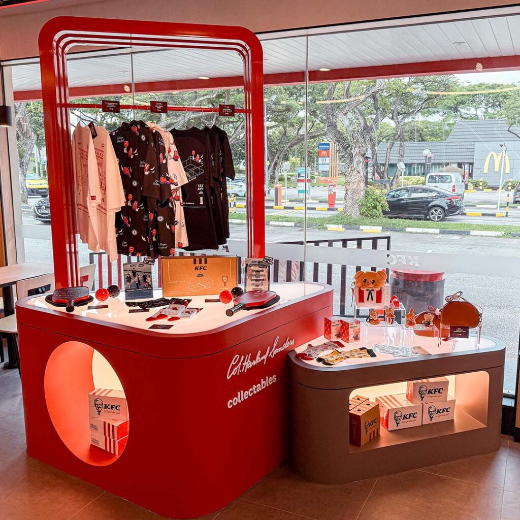 With such momentum for these non-food fan favourites, KFC is dedicating an entire section of its new flagship outlet in Kallang to a physical merchandise space. Completing the experience, diners can now touch the actual goods – pieces sized S/M, L/XL and XXL will be on display – as the smell of delicious fried chicken wafts through the air.