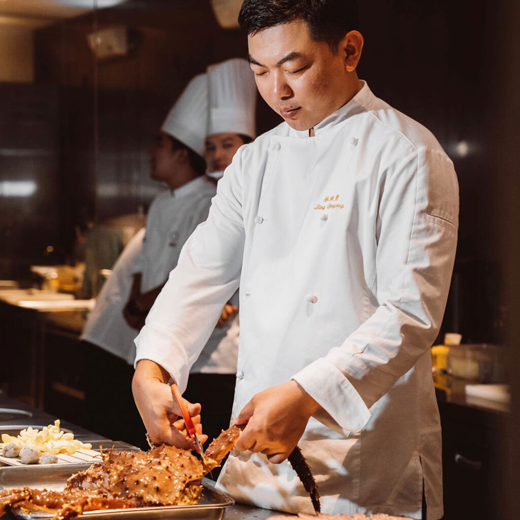 Now located at Suntec City, the restaurant stays true to its “Linjia” philosophy—literally meaning “the neighbour’s house”—where guests are welcomed like family. The space reflects this ethos with dark wood finishes, deep teal walls, and softly glowing lanterns that create a calm, intimate mood. Nothing feels showy here; the focus is firmly on food, produce, and balance.