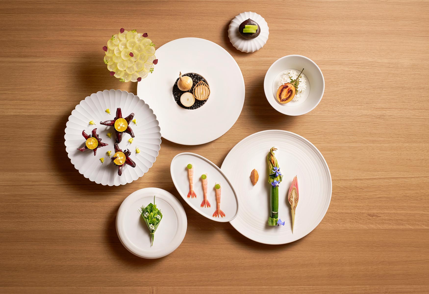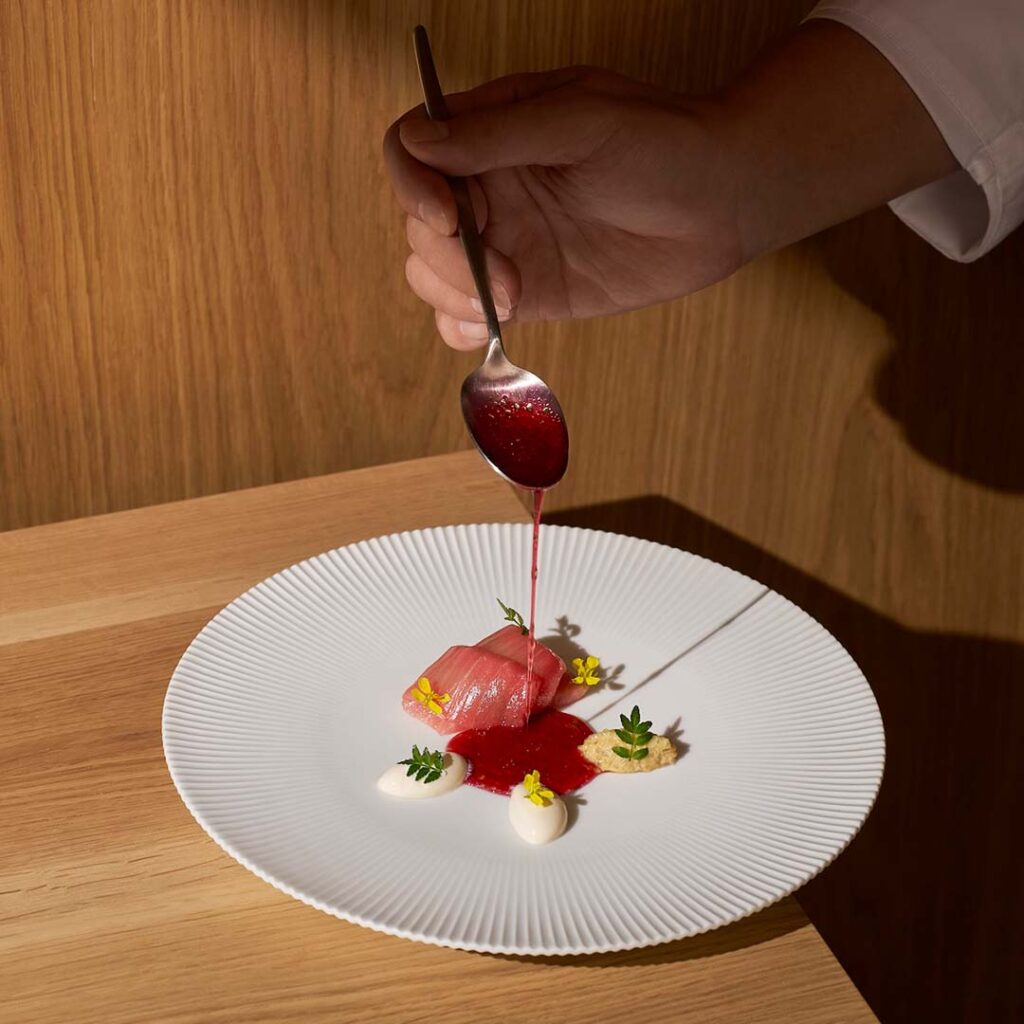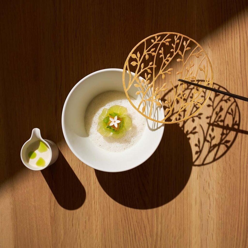 The cuisine of Loca Niru is Contemporary Innovative, in which inspiration from tradition, together with the marriage of Japanese sensibilities and French technique, create forms that are new and novel. It is a manifestation of Chef Shu’s personal belief that ‘one must learn from the past to create the future’. Also a cornerstone is the profound respect for produce and the people behind it. Livestock farmers, fishermen, growers and artisans are seen as collaborators – and their work is honoured through a ‘less is more’ approach. The team cooks and presents in a way that lets the magnificent, seasonal ingredients shine. Carefully calibrated applications of French and Japanese technique subtly distil and layer flavours in a further ode to the beauty of produce.
