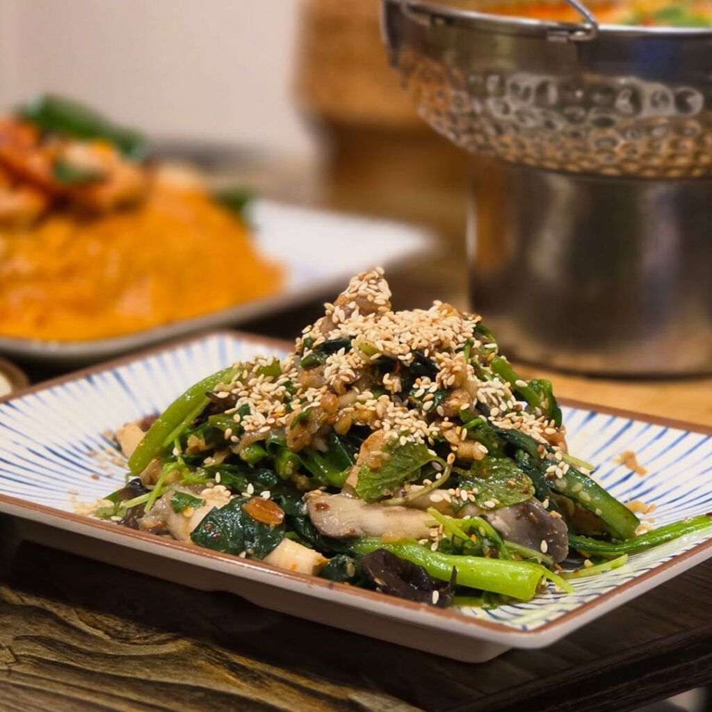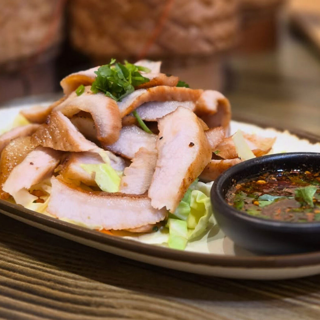 What sets Ma Der Kin Khao apart is its rare combination of Thai Isan and Laotian cuisine — flavours that remain relatively underrepresented in Singapore’s dining scene. The name itself means “come eat” in Lao, reflecting the restaurant’s warm, home-style spirit. The menu features dishes rooted in traditional Southeast Asian cooking, with highlights such as Soop Pak Lao, a vibrant Laotian salad of blanched greens and mushrooms tossed in a punchy dressing of fermented fish sauce, ginger, garlic, chillies and sesame seeds.