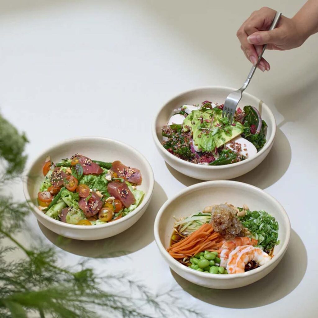 At the heart of the venue is The Slow House — a café by day that eases into a relaxed evening bar. Guests can settle into the breezy main area or the herb-lined alfresco terrace while enjoying a menu of wholesome dishes and light bites. Expect colourful salads, açai bowls and almond panna cotta alongside heartier options such as the Maison Club Panini or Crab Claw Orecchiette, both crafted with thoughtful detail.