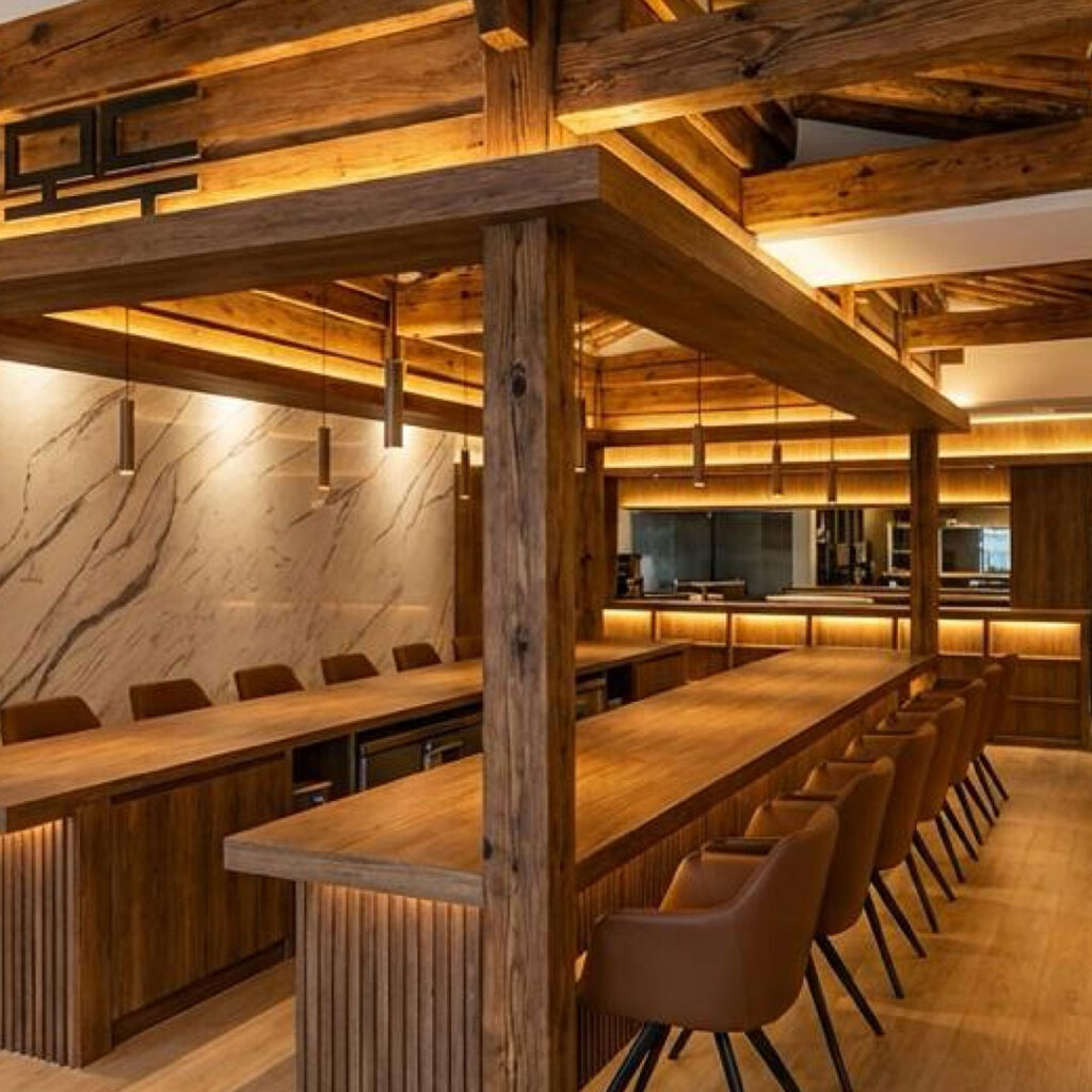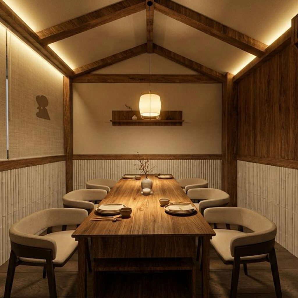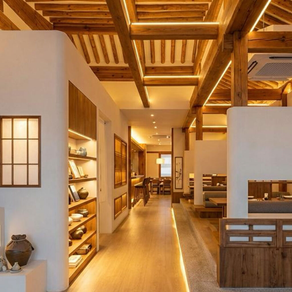 MODERN HANOK MEETS URBAN SERENITY A contemporary interpretation of the Hanok combines traditional Korean aesthetics with modern design. Warm woods, forest green accents, and terracotta tones create a serene, Instagrammable sanctuary in the heart of Singapore’s CBD.