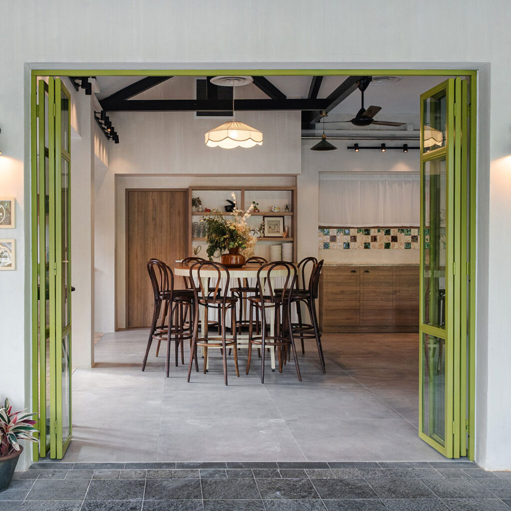 The interior of Park Side is inspired by a charming cottage by the park, featuring nature-inspired lighting, floral prints, soft muslin fabrics, and subtle Edwardian-era influences. Hand-sketched illustrations of whimsical animals commonly found around the Singapore Botanic Gardens add a playful and distinctive brand touch throughout the space.