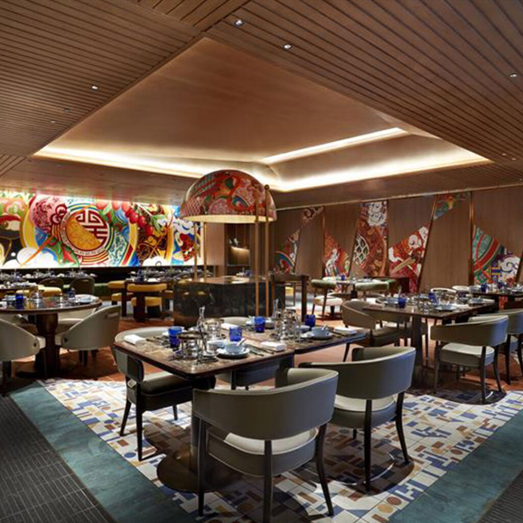 A defining feature of the space is a striking custom mural by Singapore contemporary artist Sam Lo, whose work forms a visual centrepiece of the restaurant.