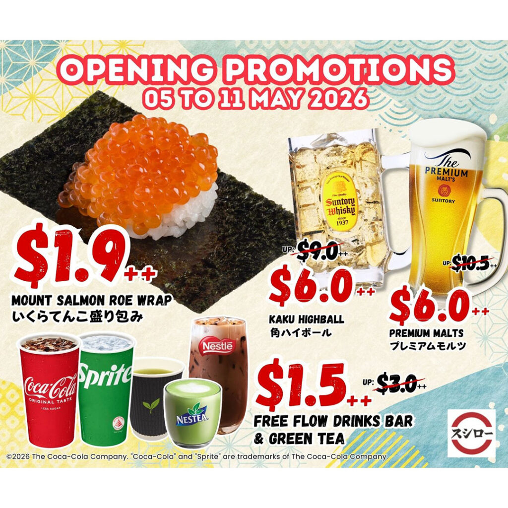 Building on the opening momentum, the promotions continue from 5 May to 11 May with Mount Salmon Roe Wrap at S$1.9++, offering a taste of SUSHIRO’s freshness and quality sushi at an exceptional value.