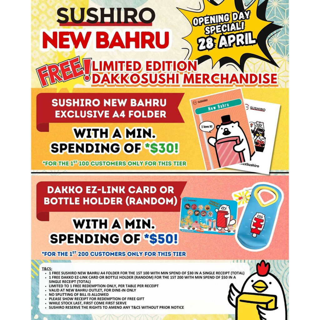 In addition to the dining promotions, customers visiting SUSHIRO New Bahru on 28 April 2026 can also look forward to exclusive opening day redemptions, featuring limited edition Dakkosushi merchandise.