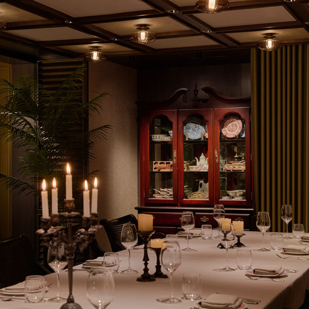 Furnished with original cabinets belonging to Gilmore, The Caretaker’s Room also serves as a custodial space. Pieces from The Gilmore Collection are housed here, with ceramics, heirloom items, and culturally significant memorabilia offering a glimpse into the family’s Eurasian and Peranakan heritage. Together with family photographs and antique tableware from Chef Damian’s personal collection, these time-honoured belongings transform the room into more than just a dining space — part archive, part homage to generations past.
