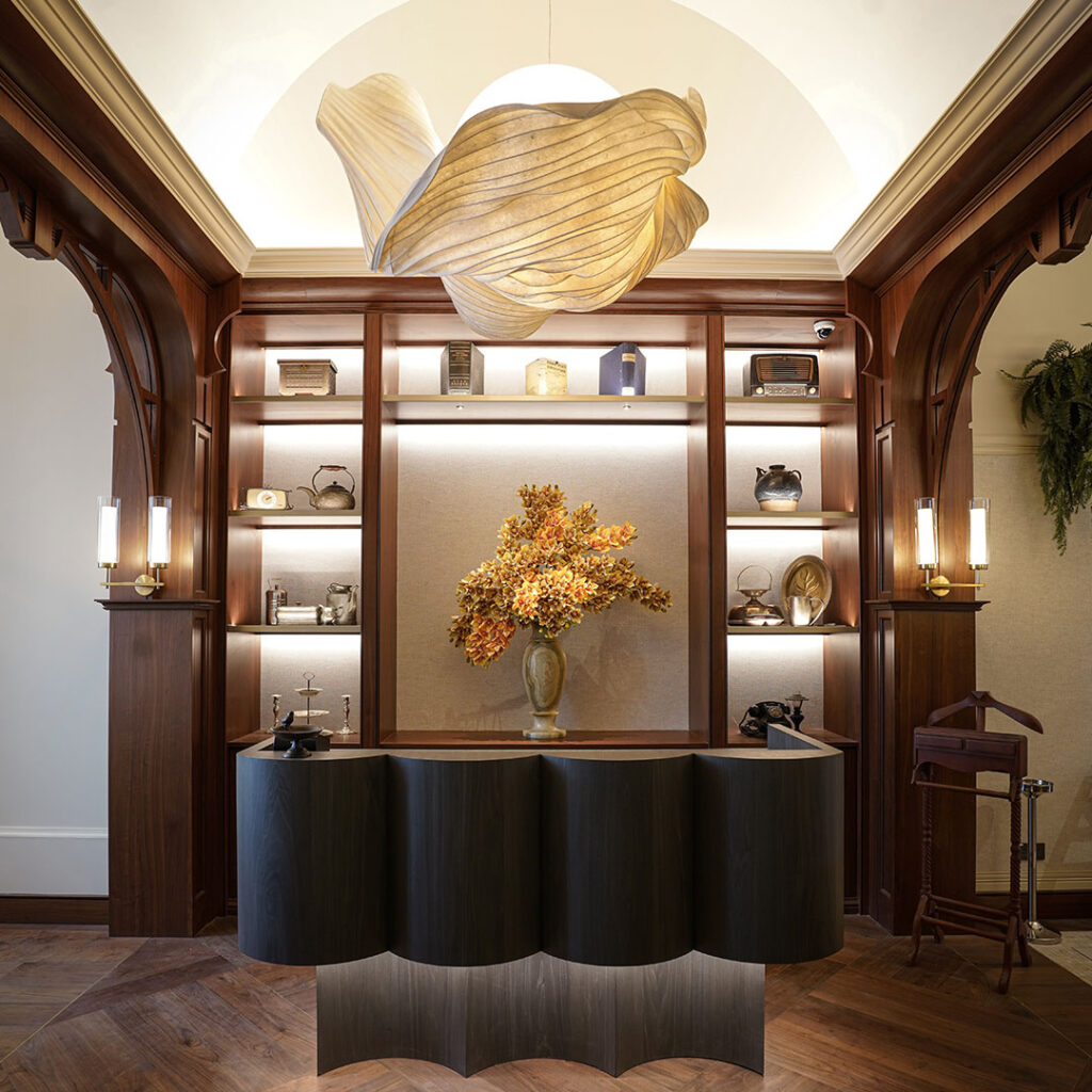 The warmth of the main dining hall extends into The Caretaker’s Room, where a familiar palette of browns and whites creates a sense of visual continuity. Thoughtfully designed, the space features custom-made carpets and acoustic panels in the ceiling that complement the neutral colour scheme — welcoming guests to take a seat and enjoy the same warm hospitality that many have experienced at Gilmore D’Silva’s dining table.
