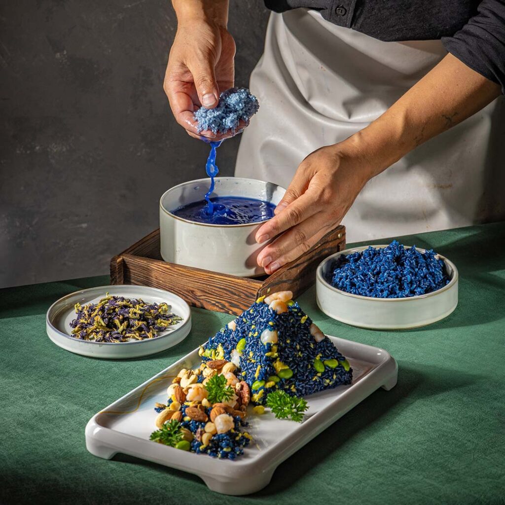 Rice, ever a staple in Chinese restaurants, is also on the menu. Elevate any occasion with the Lobster Fried Rice ($48.90), a centrepiece with an entire, majestic lobster. Or try The Soup Expert’s tongue-in-cheek Blue Friend Fried Rice ($15.90), a blue pyramid of grains where Dongbei rice, tinted with blue pea flower, is tossed with edamame, cashews, and almonds for crunch. Its Chinese name, 蓝朋友炒饭, sounds like “boyfriend fried rice”, symbolising a dish made with love.