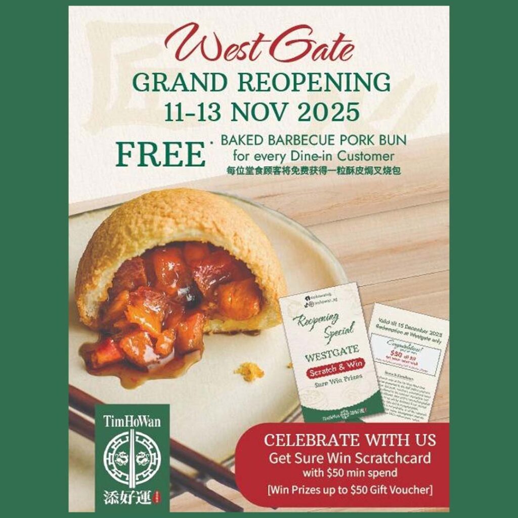 To mark this joyous occasion, from 11 to 13 November 2025, Tim Ho Wan Westgate will be giving away Free Baked BBQ Pork Bun for every dine-in customer, along with a Sure-Win Scratch Card with a minimum spend of $50 — featuring prizes such as discounts of up to $50 off the bill, Free Dim Sum, and  Free Desserts to be won!