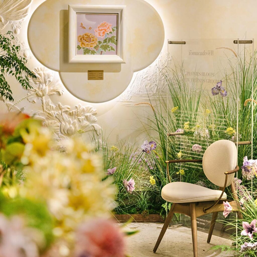 Staying true to its “one store, one palette” design philosophy, Tomacado Singapore’s interiors blossom from the inspiration of the Chinese peony and Singapore’s national flower, the Vanda Miss Joaquim. In this intimate space, prosperous and auspicious Eastern charm, blends with the stylish elegance of the Lion City’s Nanyang style, creating a floral dialogue that transcends cultural boundaries.