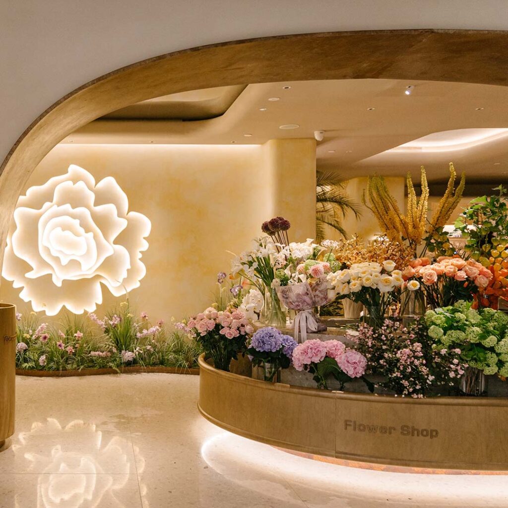 Furthermore, the store design thoughtfully incorporates peony motifs and the traditional latticed windows of Chinese gardens, forging a breathtaking spatial experience. Upon entering, baby pink tones and lilac peony art installations cascade throughout the entrance, flower shop, and dining area, accentuated by graceful curved lines that evoke a calm and romantic atmosphere. Each turn reveals a new perspective, as if stepping into a carefully composed painting; soft wall tones harmonise with the peony details, accented by plush velvet sofas. The overall palette is kept light and airy, enhanced by greenery arranged with meticulous care, conjuring the experience of dining deep within a peony garden.