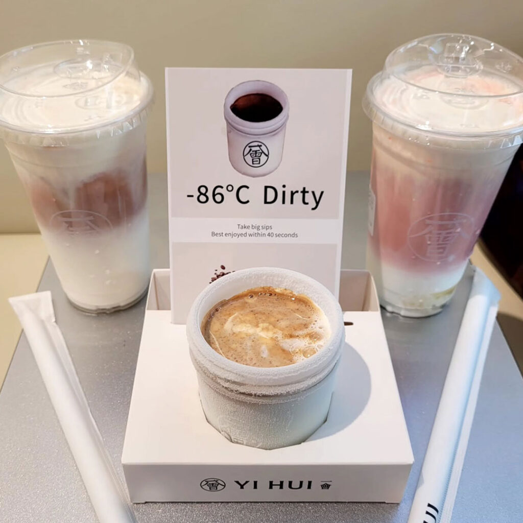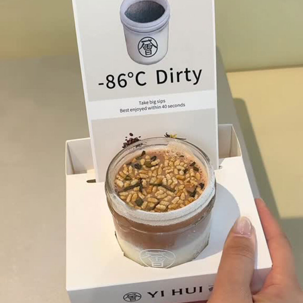 The menu ranges across both tea and coffee, with drinks built around natural flavour profiles rather than heavy syrups or artificial mixes. One of the most talked-about items is the viral -86°C Dirty Vanilla Coffee, served in a super-chilled glass before a fresh espresso shot is poured over cold milk for a smooth, layered finish. Alongside it are milk teas and brewed options that lean floral, creamy, or earthy, including white peach oolong, rose-infused blends, and roasted pu’er, each prepared to highlight the character of the tea itself.
