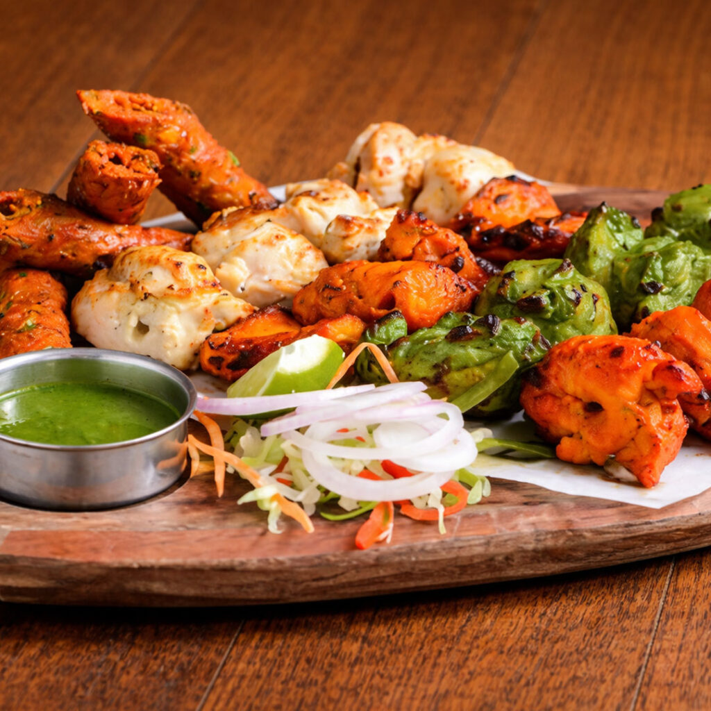 From the tandoor, the Tandoori Platter presents a generous selection of meats marinated in aromatic spices and charcoal-grilled to perfection — smoky, juicy, and deeply flavorful, capturing the essence of North Indian cooking. A perennial favorite, the Butter Chicken features tender pieces of chicken simmered in a rich, velvety gravy infused with butter, cream, and warm spices, making it a comforting classic best enjoyed with naan or fragrant basmati rice.