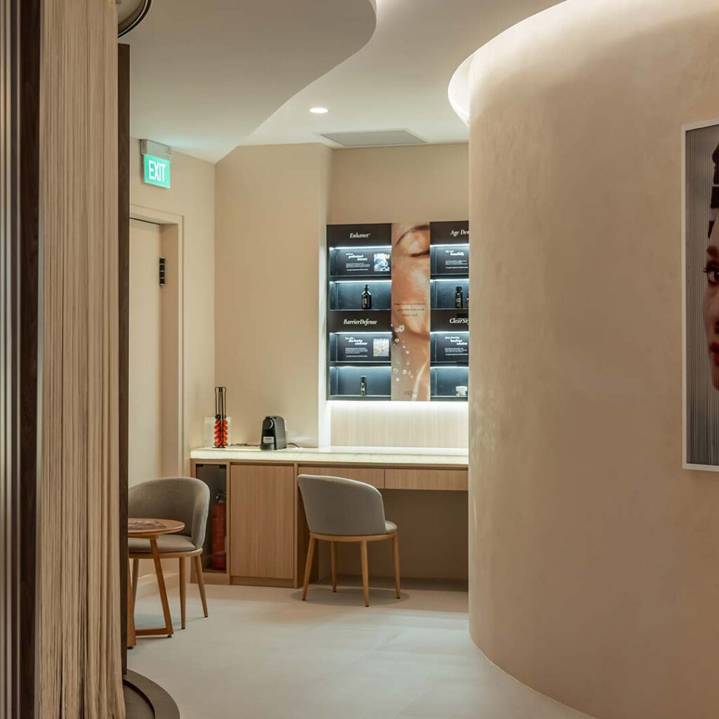 With a convenient ground floor access, SSKINS Medispa welcomes clients into an interior that exudes modern luxury and timeless elegance, where soothing earth tones, graceful curved lines, and cosy spaces create an atmosphere of comfort and calm. Spanning over 1,500 sq ft, the medispa has six treatment rooms, and two hair pods.