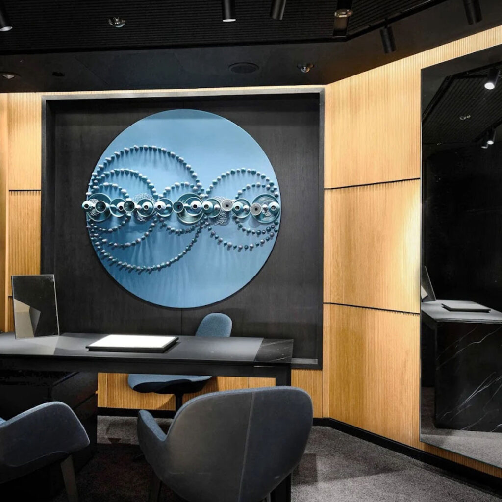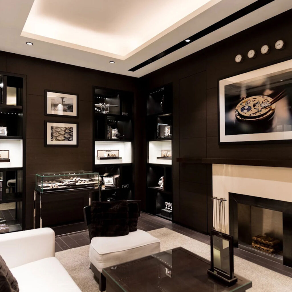 At the heart of the boutique is a comfortable lounge where visitors can explore the latest novelties at ease. Look closer and you’ll spot thoughtful design details, including the Pantone light blue Miramar shade developed as an IWC ceramic hue, first introduced on select Pilot’s Watch Chronograph 41 models. Surrounding display modules spotlight the brand’s technical hallmarks — from moonphase complications and the 400-Year Gear to material innovations — presented with clarity and restraint. Dedicated bar and watchmaking workshop areas further elevate the in-store experience.