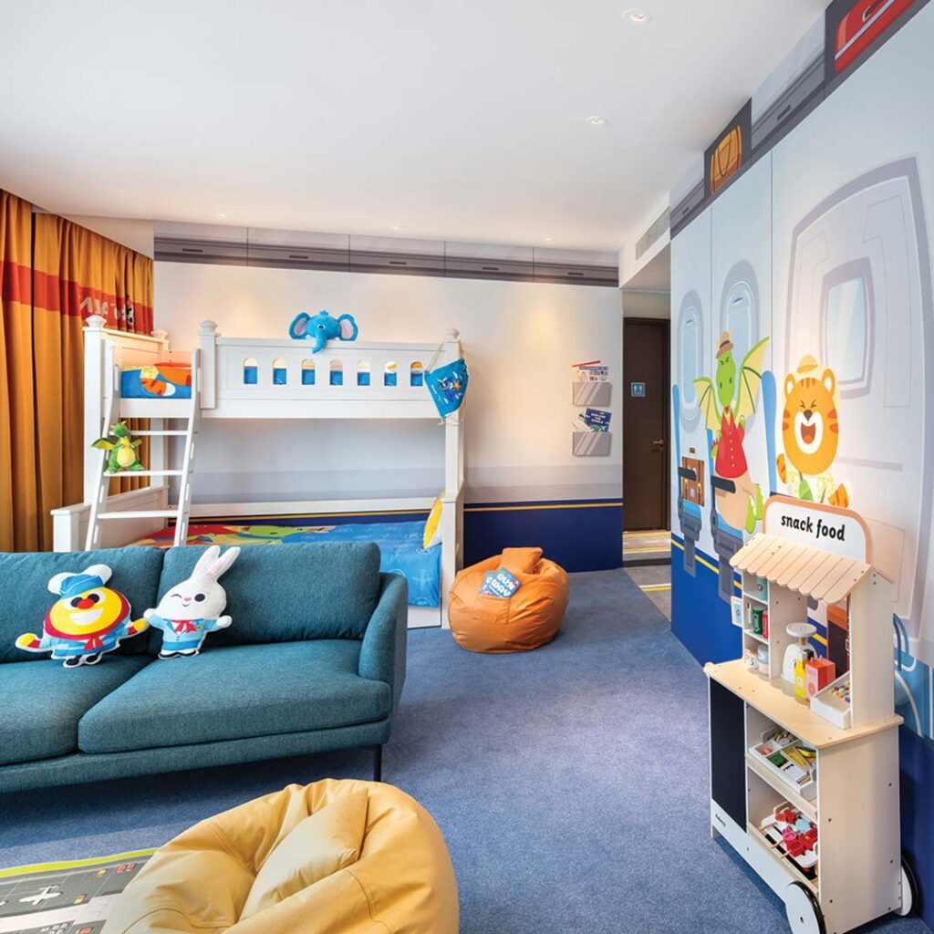 Located on the sixth to eighth floors, each suite features stunning, uninterrupted views of Jewel Changi Airport and the iconic Control Tower, visible right from your window. Inside, children will find a rocking plane chair, snack trolley playset, bean bags, and themed linens—creating a vibrant, immersive setting that blends play with comfort. A pantry area styled like an aircraft galley adds to the excitement, while the master bedroom provides a calm retreat with a king bed, double walk-in closet, and a spacious bathroom equipped with a bathtub, dual sinks, and kid-friendly amenities.