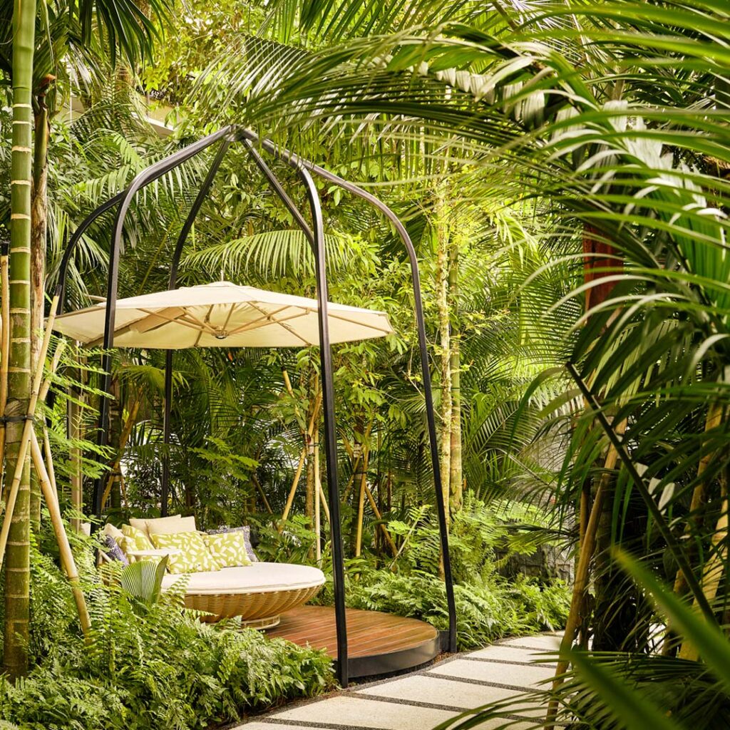 At the heart of this lush experience is a multi-tiered waterfall, featuring granite reclaimed during the hotel’s transformation. Nearby, curated sculpture trails and play elements invite discovery for families, while elevated lawns host yoga, bootcamps, and wellness programmes. This comprehensive landscape vision not only elevates the guest experience, but actively contributes to Singapore’s biodiversity through expanded pollinator habitats and rainwater-fed ecosystems.