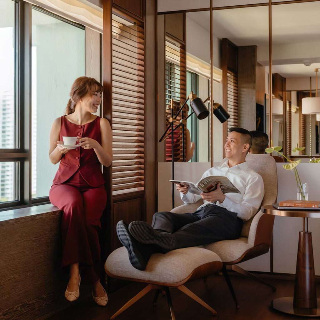 Designed by Tokyo-based studio Strickland, the Grand Wing offers a refined urban experience infused with the vibrancy of Singapore. All 407 rooms, including redesigned Deluxe Rooms, now feature open-plan spaces with warm walnut flooring, Peranakan-inspired accents, and striking Patagonia Stone in the bathrooms. Terracotta orange tones and contemporary geometric patterns reflect the city’s energy while maintaining the serenity of a luxurious stay.