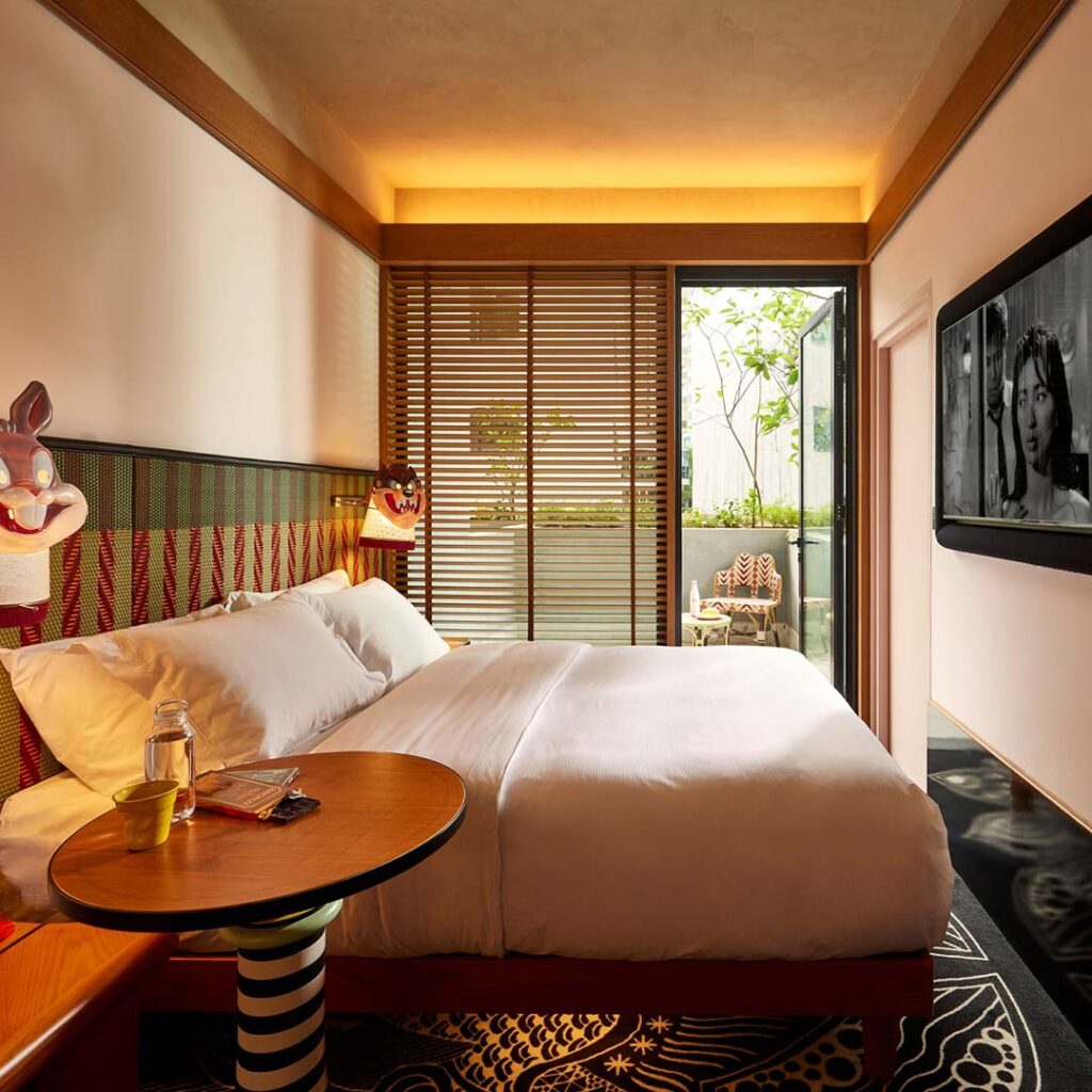 Mama Shelter has officially arrived in Singapore, marking the quirky French boutique hotel chain’s first outpost in Asia. Located on Killiney Road near Somerset MRT, the 115-room hotel stands apart from the usual sleek city stays with a riot of colour and playful design. Rooms are compact yet full of character, ranging from 15-square-metre bunk rooms to 17-square-metre doubles, with nearly half featuring private terraces. Expect maximalist patterns, eclectic touches, and even bedside lamps topped with Bugs Bunny masks.